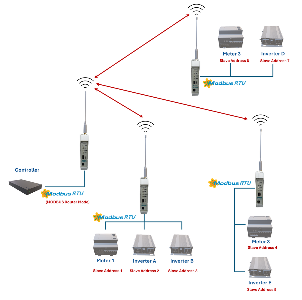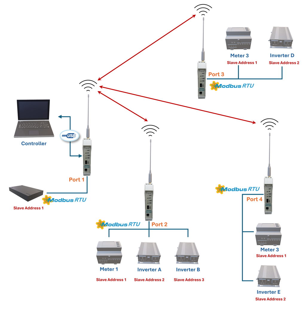 In this configuration, each Remote Device will provide individual access to not only their registers but also their RS-485 ports, which in the above example are used for MODBUS-RTU. Here port slave addressing is only relative to the Port Link port a Site Asset may be connected through, which greatly simplifies installation and allows for a far greater number of Site Assets to be connected through a single Network.